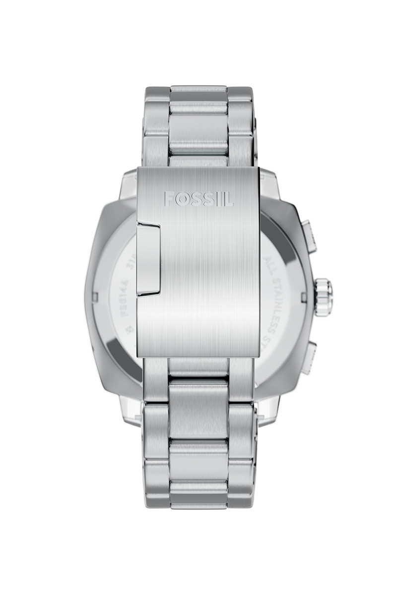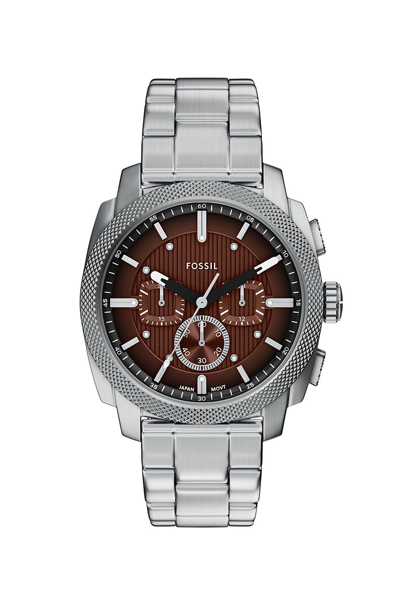 Fossil Machine muški hronograf ima 44mm srebrno kućište, braon brojčanik sa narandžastim kazaljkama, mineralno staklo i srebrnu narukvicu od nerđajućeg čelika.
